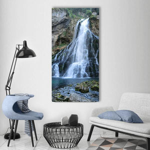A photorealistic scene of a cascading waterfall framed by mossy rocks and a forest pool. The image feels serene, majestic, and powerful, with blue, green, gray, and white tones that emphasize depth and motion. Suits modern or nature-inspired rooms as a calming focal point.