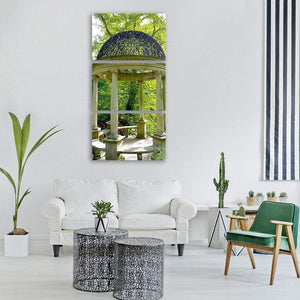 A photographic canvas print centered on a stone gazebo with columns, a bench, and leafy trees, rendered in soft greens, grays, browns, and white. The symmetrical composition creates a peaceful, serene mood and suits modern or nature-inspired interiors.