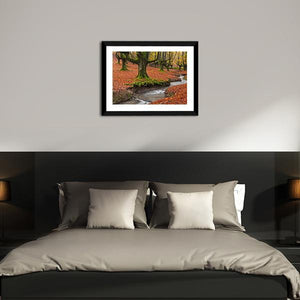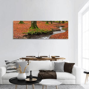 A panoramic print of a winding forest stream edged with mossy trees and fallen autumn leaves. Motion blur in the water and a brown, green, and orange palette give the scene a peaceful, natural autumnal mood. Works well in modern or nature‑inspired rooms as a calm focal piece.