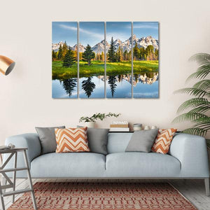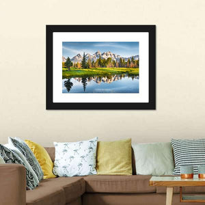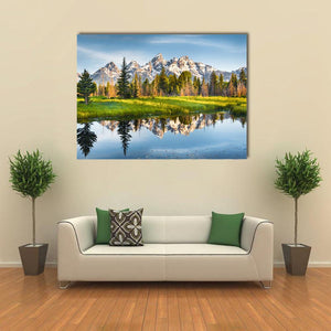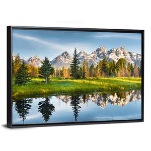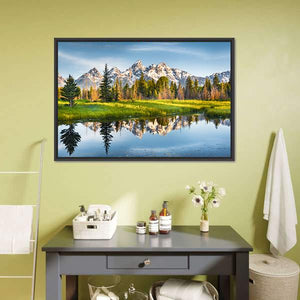 This artwork captures the serene beauty of the Grand Teton Range, showcasing majestic mountains, tranquil lakes, and vibrant pine trees. Its realistic depiction invites a peaceful atmosphere, making it a wonderful addition to any nature-inspired décor.