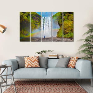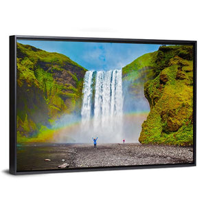 Experience the breathtaking beauty of a majestic waterfall in Iceland, where vibrant greens and blues meet the white mist. A captivating scene features a rainbow peeking through the cascade, complemented by adventurous figures embracing the moment.