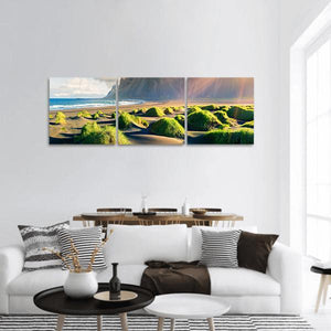A photographic panoramic of green dunes and Vestrahorn, with small grassy mounds along a coastal beach and sunbeams breaking through clouds. The naturalistic scene reads serene and quietly dramatic, a tranquil focal point for modern or nature-inspired rooms.
