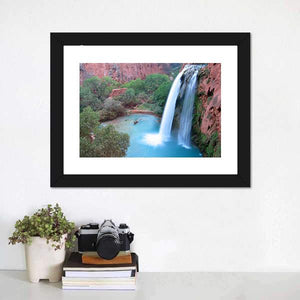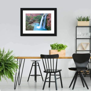 This beautiful canvas features Havasu Falls, showcasing a high angle view of the waterfall cascading over a cliff into a bright turquoise pool below. The vibrant colors of blue, green, and red evoke a serene and natural atmosphere, perfect for enhancing any space.