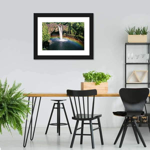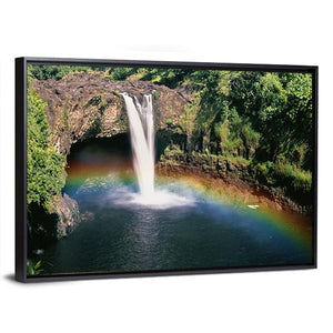 Hawaii Rainbow Falls Canvas shows a realistic waterfall scene with rocks, flowing water and a rainbow visible in the mist. The rule-of-thirds composition and a palette of greens, blues, whites and warm accents create a serene, natural, vibrant mood that suits modern or nature-themed rooms.