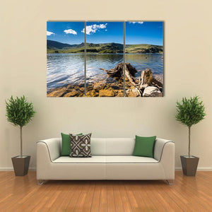 This canvas art features a serene landscape of Haweswater Reservoir, showcasing a tree stump by a tranquil lake, surrounded by majestic mountains and a bright sky. The natural colors of blue and green evoke a peaceful atmosphere, making it an inviting addition to your wall decor.