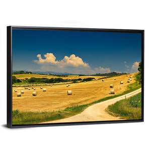 This canvas art depicts serene rolled hay bales on a harvested field, complemented by rolling hills and a winding dirt road under a blue sky. The warm golden hues create a peaceful and rustic atmosphere, perfect for nature lovers.