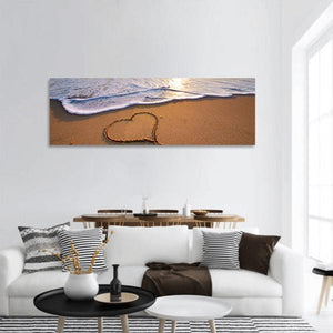 A heart drawn in the sand at sunset sits in a panoramic composition of soft orange, white, and brown, creating a romantic, serene beach scene. The minimalist, modern layout follows the rule of thirds and reads peaceful—suitable for modern living rooms or a calm bedroom.