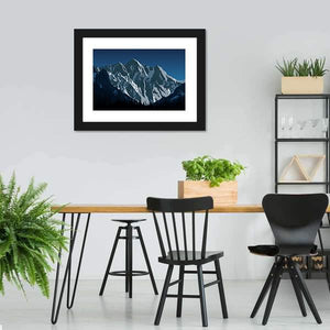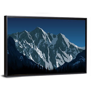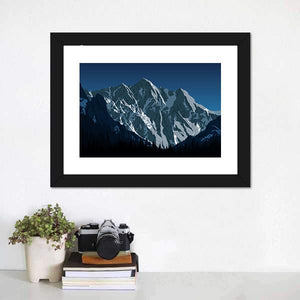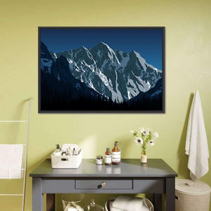 This artwork captures serene snow-capped mountains and dense pine trees under a vast night sky. With a calming palette of blue, grey, and black, it adds a touch of nature's majesty to your decor.