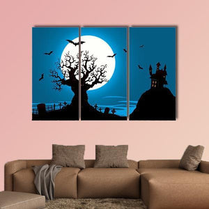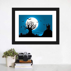 A silhouetted haunted house, gnarled tree and graveyard gather beneath a full moon, with bats drifting across a blue, black and white sky. Rendered in a silhouette style, the scene feels spooky and mysterious—suitable for Halloween wall art or moody, modern room decor.