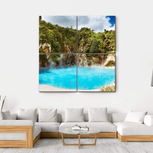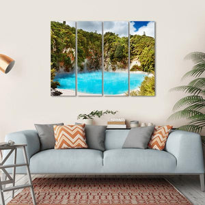 This canvas art captures the serene beauty of New Zealand's volcanic landscape, showcasing vibrant turquoise waters, lush green cliffs, and wisps of steam rising from hot springs. Its natural atmosphere brings a touch of tranquility to any space.