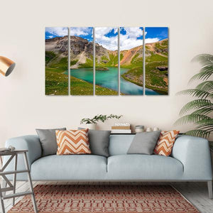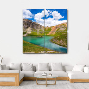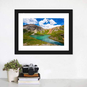 This landscape canvas art captures the serene beauty of a turquoise lake surrounded by majestic mountains and puffy white clouds. The realistic portrayal invites a peaceful atmosphere, making it a wonderful addition to any nature-inspired decor.