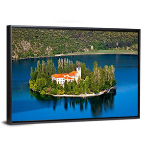 Capture the serene beauty of Croatia’s River Krka with this stunning canvas featuring a tranquil island. The artwork showcases a picturesque scene with vibrant blue waters, lush green hills, and a charming white building with an orange roof, evoking a sense of peace and natural beauty.