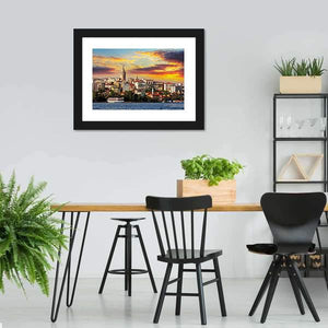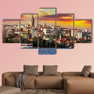 This canvas depicts Istanbul’s skyline with Galata Tower above the Bosphorus and a boat on the water at sunset. Rendered in a realistic, vibrant style with blues, oranges, yellows, white and brown, it gives a picturesque, scenic feel and works well with home room decor. The composition follows the rule of thirds, placing the sunset and skyline for balanced focus.