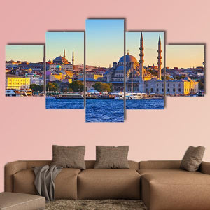 Istanbul Sunset Turkey Canvas Wall Art shows a serene waterfront cityscape with mosques, minarets and domes bathed in warm sunset light. Rendered in a realistic style with blues, oranges, whites and browns, the scene includes boats on the water and sunlight on the skyline for a picturesque mood. Works well as modern room decor in living rooms, studies, or entryways.