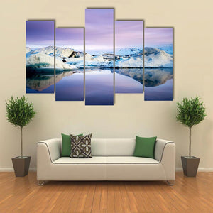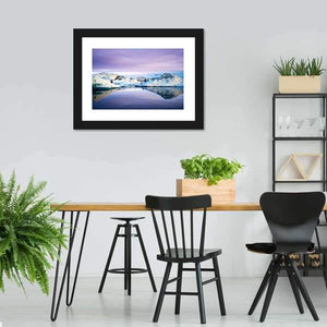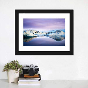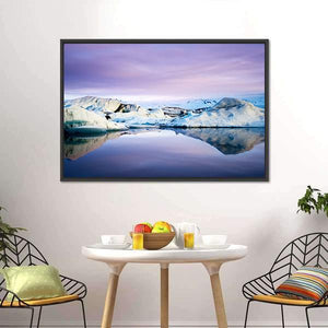Jokulsarlon Glacier Lagoon Canvas depicts icebergs resting on a glassy lake with mountains and sky in soft purple, blue, white, and gray tones. The realistic photograph highlights a smooth water reflection and a serene, cold, tranquil atmosphere. It fits well as modern room decor for living rooms or bedrooms.