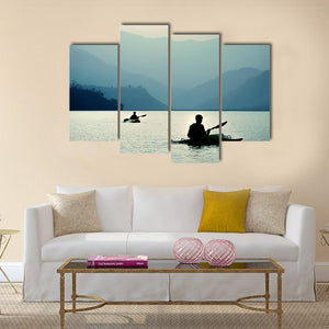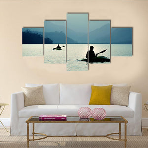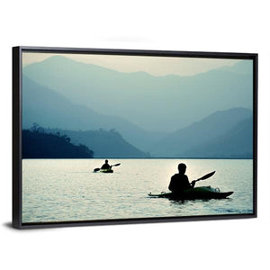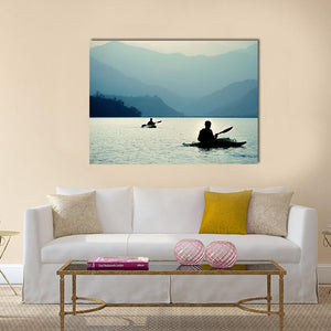 This serene canvas art captures the tranquil beauty of kayakers silhouetted against layered mountains at sunset. The calm water reflects a soothing palette of blue and gray, making it an ideal addition to any modern decor.