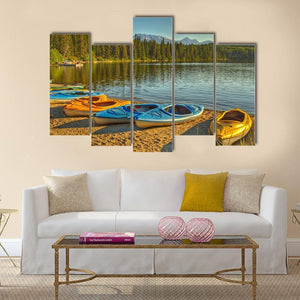 This realistic canvas art captures five kayaks lined up on a sandy shore, with a serene lake reflecting the surrounding pine forest and distant mountains. The peaceful atmosphere evokes a sense of adventure, making it a beautiful addition to any nature lover's space.