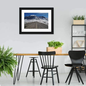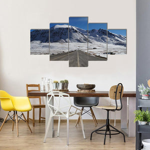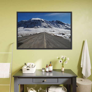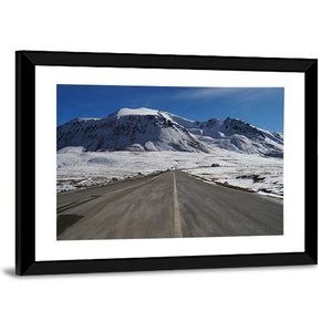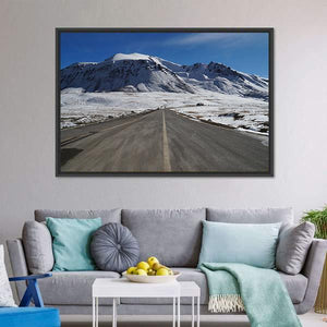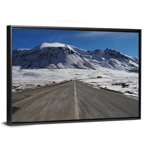 This canvas art captures a serene view of the Khunjerab Pass, featuring a winding road surrounded by majestic snowy mountains and an expansive sky. The realistic style and vastness of the scene invite a feeling of isolation and tranquility.
