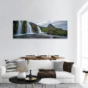 Kirkjufellsfoss On Cloudy Day presents the Icelandic waterfall and dramatic mountain peak in a panoramic, long-exposure photograph. Muted greens, grays and whites give the scene a serene, majestic feeling. Suited to modern, nature-inspired interiors as a calm focal point.