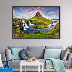 Kirkjufellsfoss Waterfall captures cascading falls, a river, and distant mountains beneath a cloudy sky touched with sunset colors. The print feels serene and majestic, with green, blue, pink, and white tones that suit modern or nature-inspired rooms.
