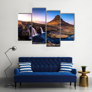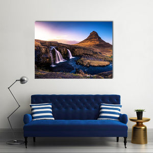 This canvas shows a long-exposure waterfall flowing beneath a pointed mountain peak in Iceland, rendered in blues, oranges, greens and browns. The realistic landscape feels serene and dramatic, and it works well in modern living rooms or entryways.