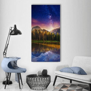 A photorealistic landscape showing a Milky Way night sky above glowing mountains, a forested shore, and a calm lake that mirrors the scene. The composition feels serene and mystical, and it works well in modern, nature-inspired spaces.