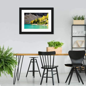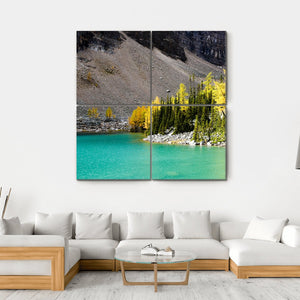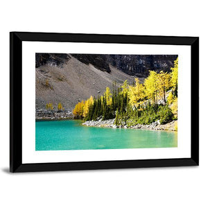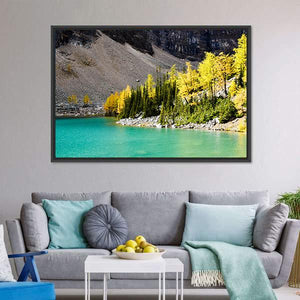 Experience the serene beauty of Lake Agnes in autumn. This canvas showcases vibrant turquoise waters and striking yellow deciduous trees set against dark evergreen forests and rocky mountains, capturing the natural allure of the season.