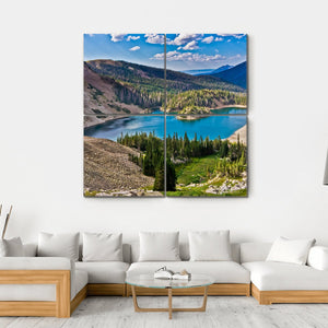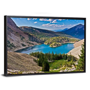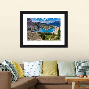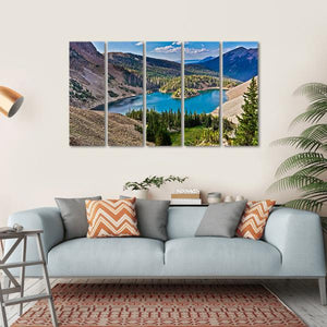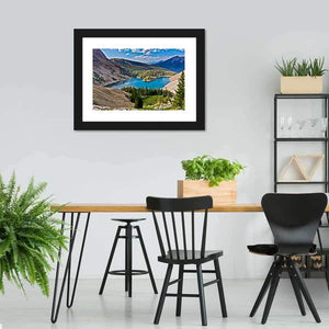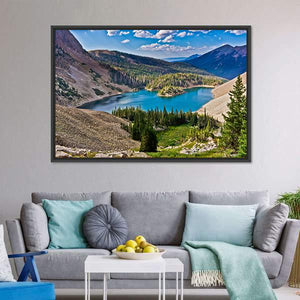 This landscape art captures the serene beauty of Lake Agnes, nestled among majestic mountains and lush forests. The vibrant palette of blues, greens, and browns reflects a natural, picturesque scene, making it a stunning addition to any wall décor.
