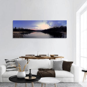 Lake At Sunset Panoramic Canvas Wall Art captures a lake at dusk framed by forest, reeds, and a dock with soft reflections across the water. Muted blues, purples, and pinks create a calm, serene twilight mood that fits modern, nature-inspired interiors.