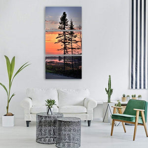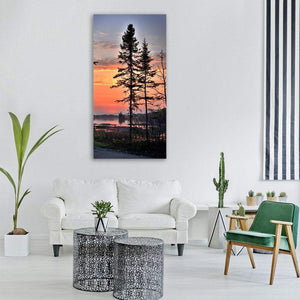 A photographic scene of a calm lake edged by pine tree silhouettes beneath a warm sunset sky with birds in the air. Soft oranges, pinks and blues create a serene, peaceful twilight mood suited to modern or nature-focused rooms as wall decor.