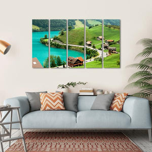 This canvas print captures the tranquil beauty of Lake Brienz in Switzerland, featuring rolling hills, charming houses with red roofs, and a tree-lined road. The serene palette of turquoise water and lush greens creates an idyllic atmosphere, perfect for adding a touch of nature to your home.