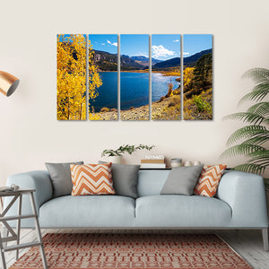 This canvas print captures a serene landscape of a lake surrounded by mountains, vibrant fall foliage, and bright yellow aspen trees under a clear sky. Its realistic style invites a peaceful atmosphere into your space, making it a beautiful addition to any room.