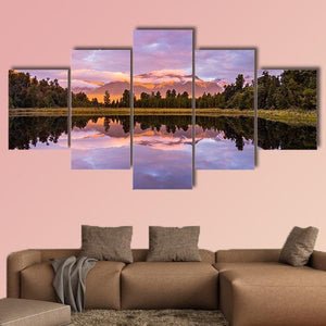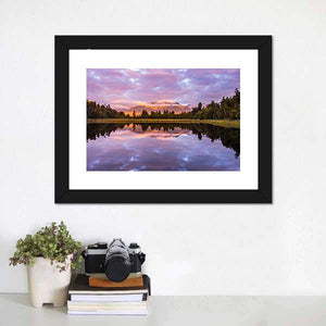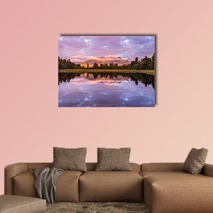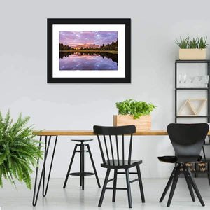 Matheson Lake Canvas Wall Art shows a calm lakeside scene with mountains, trees, and clouds mirrored in the water. Soft purples, pinks and oranges blend with greens and blues to create a serene, colorful evening atmosphere. Its realistic composition and balanced symmetry fits modern or nature-inspired rooms as a peaceful focal point.