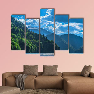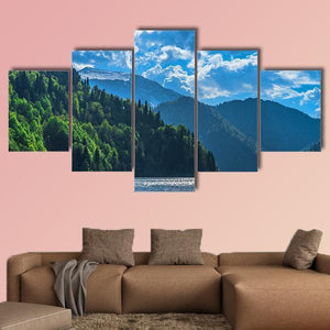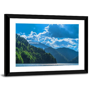 Lake Ritsa Canvas Wall Art shows a serene, bright mountain lake framed by dense forest, snow-capped peaks, and dramatic clouds. Rendered realistically with a blue-green palette and rule-of-thirds composition, it brings a calm, majestic mood that works well in modern living spaces.