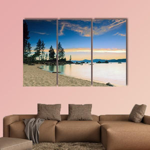 Beautiful Tahoe Lake After Sunset shows a tranquil lakeshore with pine trees on a sandy shore, gentle waves, and distant mountains beneath a soft orange-and-blue sunset. The photorealistic print feels peaceful and serene and suits modern or nature-inspired rooms.