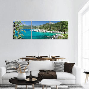 This panoramic canvas art captures the serene beauty of Lake Tahoe, featuring clear turquoise water nestled among rocky shorelines and majestic mountains. The vibrant palette of greens and blues, along with realistic depictions of pine trees, invites a sense of tranquility into your space.