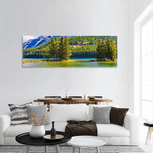 Two Jack Lake in the Rocky Mountains is rendered as a photorealistic panoramic canvas, showing clear mountain water and a dense pine forest. The scene feels serene and vibrant with green and blue tones, a natural focal point for modern living rooms or offices.