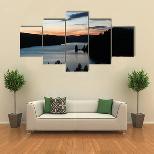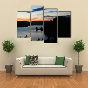 This canvas artwork captures the serene beauty of Lake Vyrnwy at sunset, highlighting the delicate silhouettes of trees and a dam against a tranquil backdrop of blues and oranges. It's a striking piece for those looking to bring a touch of nature into their space.