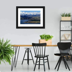 This landscape canvas features snowy mountains overlooking a serene lake and a quaint town. The clear blue sky and soft clouds enhance the natural beauty, creating a vast and relaxing atmosphere.