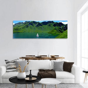 A wide panoramic landscape showing lush green mountains, a calm turquoise lake and a single white sailboat. The realistic summer scene feels serene and expansive, with a natural, peaceful mood. Works well in modern living rooms or nature-inspired spaces looking for calming wall decor.