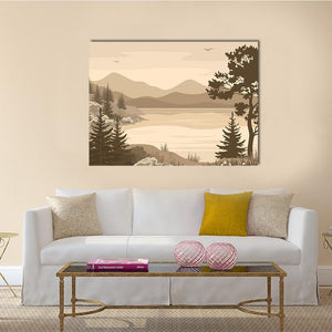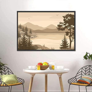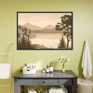 This landscape print depicts a calm lake bordered by layered mountains and stylized pine trees, with minimalistic birds along the shoreline. The muted beige, brown, tan and grey palette gives the scene a serene, natural mood. The minimalist, graphic vintage look suits modern or minimalist room decor.