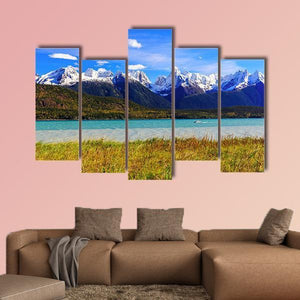 Lake With Sinclair Mountain Canvas shows a realistic landscape of snow-capped peaks, turquoise water and golden grasses beneath a clear blue sky. The scene reads as serene and majestic, a calm focal piece that suits modern living rooms and bedrooms.