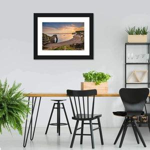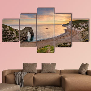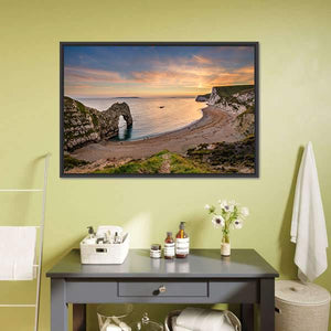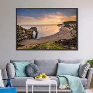 Durdle Door Canvas Wall Art depicts the rock arch at Durdle Door with coastal cliffs, beach and ocean beneath a sunset. The photographic, realistic scene feels serene and dramatic, with blue, orange, tan, green and white tones. Composed with rule of thirds and natural framing, it suits coastal or modern room decor.
