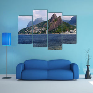 Dois Irmao Brazil Canvas Wall Art depicts two prominent peaks rising from dense green mountains above calm blue water, with houses on the hillsides and a distant coastal skyline. The realistic, photographic landscape uses a blue-green palette for a serene, picturesque mood and works well as modern room decor in living rooms or bedrooms.
