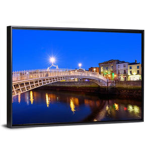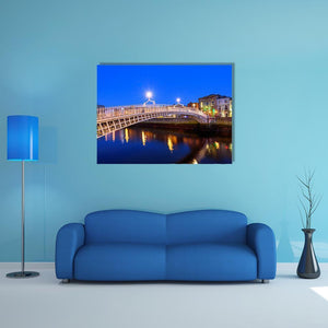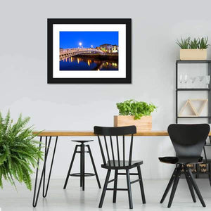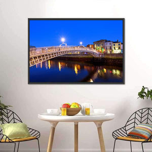 Ha'penny Bridge In Evening places the illuminated Ha'penny Bridge, river reflections, and nearby city buildings beneath a calm night sky. Rendered in a photorealistic style with blue, white, yellow, and brown tones, it creates a quiet, urban nocturnal mood that fits modern or urban room decor.
