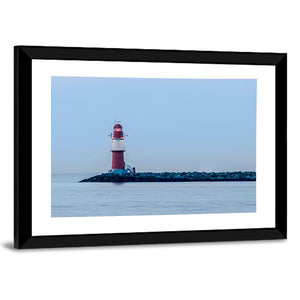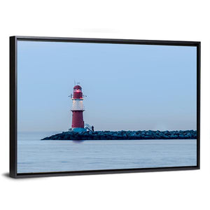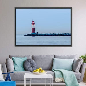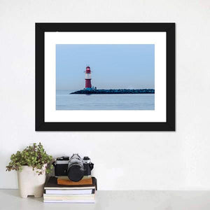 Red and White Lighthouse on Rocky Pier Canvas Wall Art