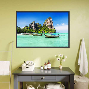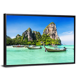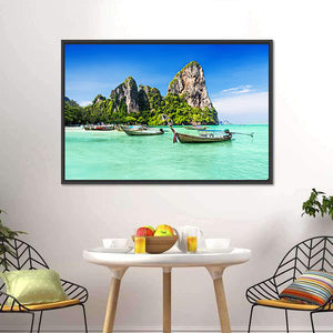 Bring the serene beauty of Thailand's beaches into your space with this canvas art featuring vibrant longtail boats against a backdrop of limestone cliffs and lush vegetation. The clear turquoise water and blue sky create a peaceful atmosphere, perfect for any coastal-themed décor.