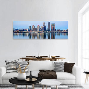 This panoramic canvas beautifully captures the serene skyline of Louisville at sunrise. Featuring tall buildings and a calm waterfront, it brings an urban yet tranquil vibe to any space.