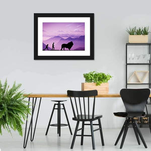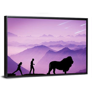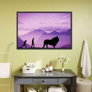 This panoramic canvas depicts a lion and human silhouettes set against layered, misty mountains in rich purples and pinks, creating a dramatic, mysterious evening scene. The minimalist, modern abstract look fits contemporary living rooms or offices as bold nature-focused wall decor.