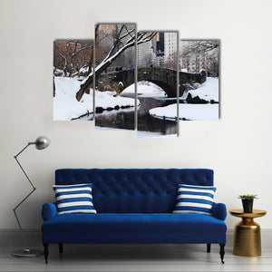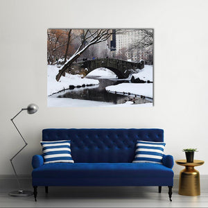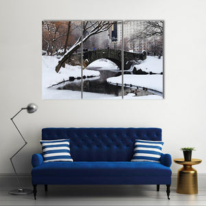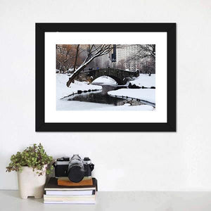 This wintery landscape features the iconic Gapstow Bridge, gracefully draped in snow. The realistic scene captures icy water, snow-covered banks, and serene ducks, making it a perfect addition to any nature-themed décor.